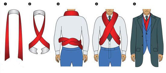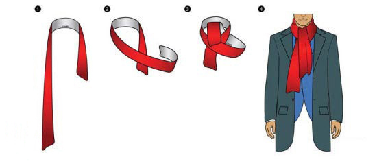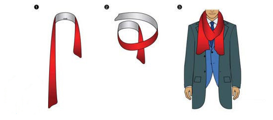 圍巾搭在脖子上,兩端在胸前交叉并從腰兩側(cè)繞至身后,在背后打上結(jié),可以作為西服的內(nèi)搭。適合長款圍巾和不太冷的天氣。