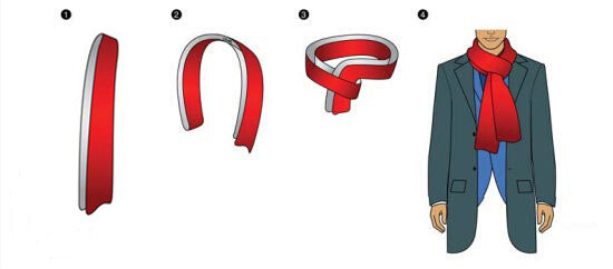 圍巾在脖子上饒一圈,整體露在造型之外,是最常見的男士圍巾系法,適合中等長度圍巾和不太冷的天氣。