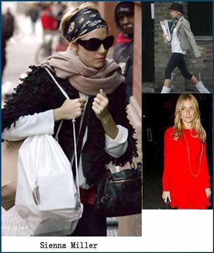 西耶娜-米勒(Sienna Miller):這位型人女王,除了用它來(lái)裝飾脖子,還用來(lái)當(dāng)發(fā)帶,不用的時(shí)候系在包上,也是另一種時(shí)尚。