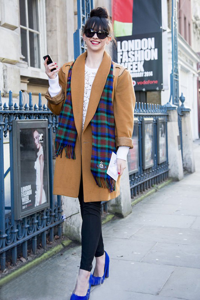 土黃色bf風大衣,既帥氣舒適又提亮膚色,一顆丸子頭清爽可愛。這一身最為出彩的當屬寶藍色高跟鞋和間寶藍色格子圍巾的搭配,完美呼應,不落俗套,潮范兒十足。