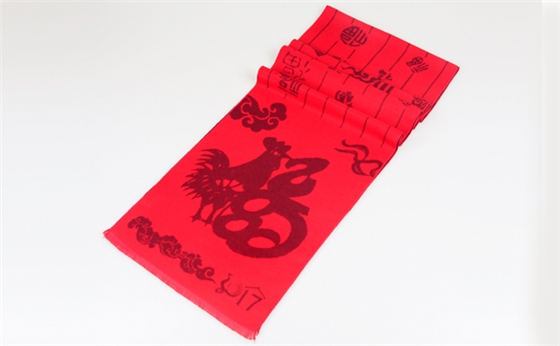 龍翔在每年的年末,還會設計下一年的生肖紅圍巾,也是十分搶手的一款大紅提花圍巾。在今年,龍翔推出了福雞的大紅圍巾。也許拉毛圍巾在提花時,圖案會變得迷糊,但是龍翔設計的大紅圍巾,經過德國進口的提花機器,提花圖案清晰,也是讓人愛不釋手的一款大紅圍巾。