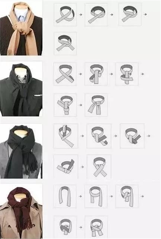 將圍巾隨意繞于頸部,最后在前方、后方或側邊打結都可以,超保暖的圍法,型男們不 妨試試看!