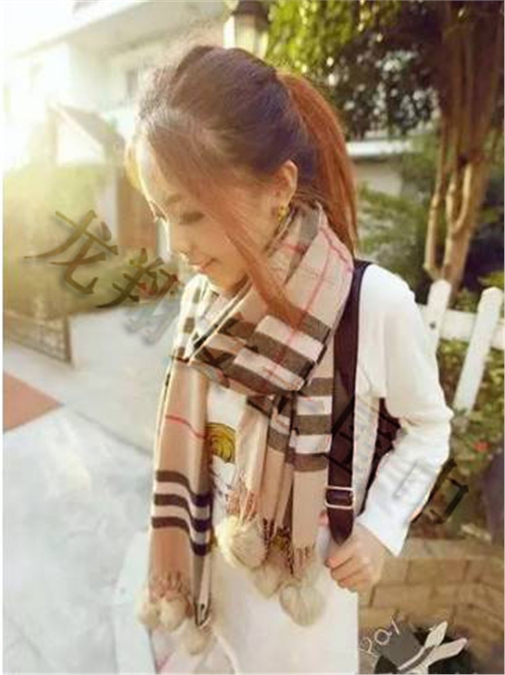格子圍巾,流蘇毛球裝飾,可愛俏皮,挺有青春活潑的氣息,搭配白色衛衣更加活力四射。