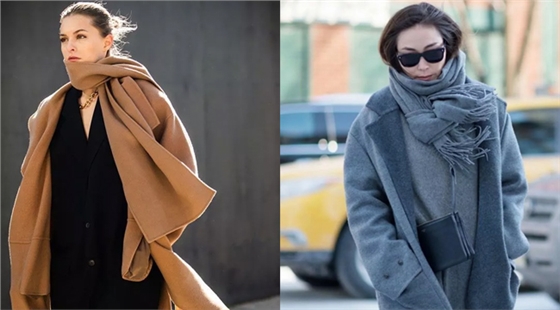 大衣厚重或版型過大時,搭配小羊絨圍巾