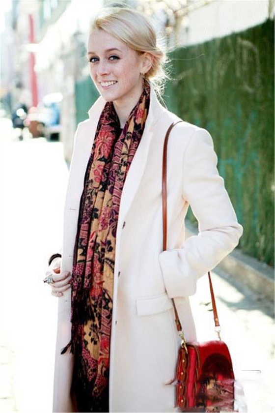 華麗的印花羊絨圍巾,烘托輕柔的貴婦氣質,白色的簡潔西裝干凈利落,為了不過于單調,一條絢麗的羊絨圍巾是極好的了。